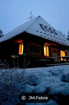 Randonnée en raquettes dans les Bauges. Repas typiquement bauju dans un charmant refuge de montagne. Retour à la lueur des frontales.